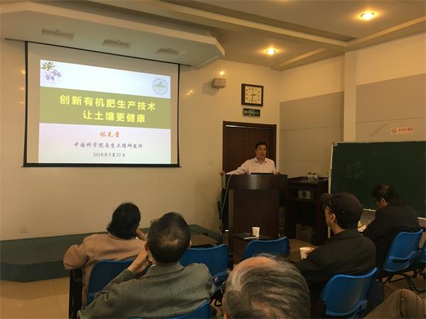 理事长张绍林主持会议并特邀研究所老科技工作者代表林先贵研究员作了题为“创新有机肥生产技术让土壤更健康”的专题报告,从土壌健康依赖有机质与微生物、有机肥快速发酵技术、技术应用与实践案例和行业发展等四个方面鞭辟入里地向大家介绍和阐述了相关技术对维护土壤健康的重要意义;指出研究土壤健康应着眼在物理、化学和生物特性,培育健康的土壤应着重科学合理施用优质的肥料;强调了作为土壤肥力的基础,施用优质的有机肥料等措施提高土壤有机质才是培育和提升土壤肥力的根本途径。
