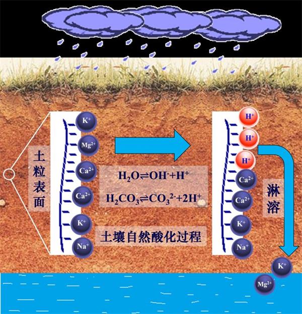 土壤中的盐基阳离子指正二价的钙和镁及正一价的钾和钠(Ca2+、Mg2+、K+、Na+),它们大部分通过静电吸引作用吸附于土壤固相表面,这也使得带负电荷的土壤表面保持电中性状态,这部分盐基阳离子称为交换性盐基阳离子。小部分盐基阳离子存在于土壤溶液中,使盐基阳离子在固/液之间保持吸附与解吸平衡。多雨条件下,土壤溶液中的盐基阳离子会随地表径流流失或沿土壤剖面向下迁移进入地下水。这一过程打破了盐基阳离子在固/液相之间的吸附-解吸平衡,原先吸附在土壤固相表面的部分交换性盐基阳离子释放到土壤溶液中,空缺的吸附位(也叫阳离子交换位)被氢离子(H+)占据,产生交换性H+,土壤发生酸化(图1)。因此,有人认为盐基阳离子是“碱”,土壤中这部分碱性物质的淋失导致了土壤酸化。这种认识是不正确的。