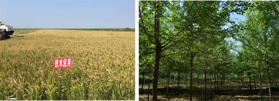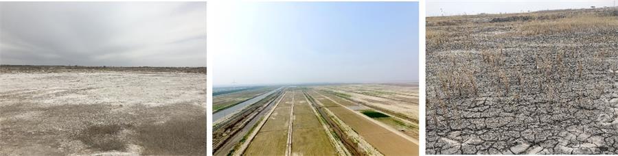 图3改良技术水稻种植应用和盐碱区生态环境改善(从左至右)
