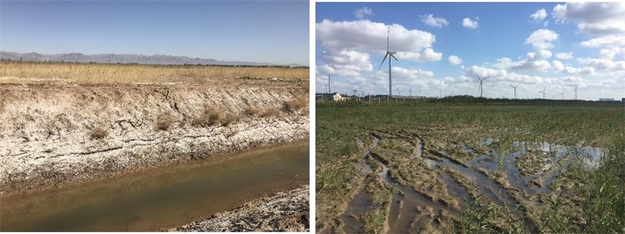 图2含盐的成土母质和地势低平的洼地(从左至右)
