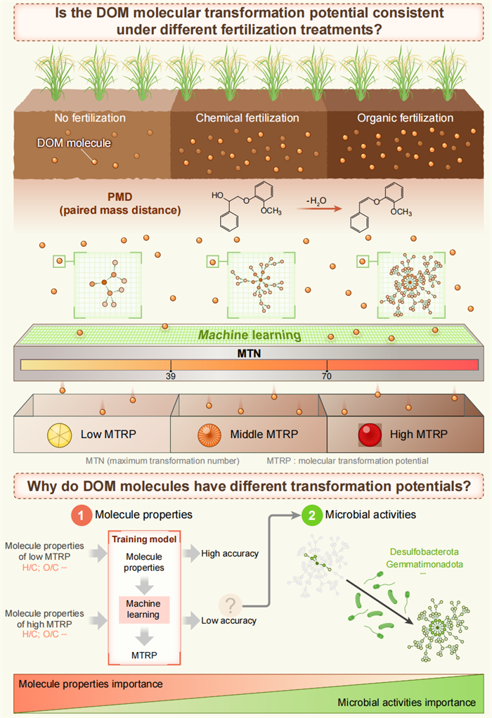 由此,好盈v3副研究员刘明团队采集了31年不施肥、施用化肥、施用有机肥3类红壤水稻土,采用基于反应组(reactomics)模型的配对质量距离(paired mass distance, PMD)分析,结合机器学习、微生物高通量测序等手段,研究了不同施肥处理下红壤水稻土DOM分子转化潜力变化。研究首先定义了DOM的分子最大转化次数(the maximum transformation number, MTN)和分子转化潜力(molecular transformation potential, MTRP)概念;发现与不施肥对照比较,长期施肥显著提高了红壤水稻土DOM的分子转化潜力,有机肥处理DOM的平均MTN提高了260%,化肥处理平均MTN提高了193%;DOM分子转化潜力可以分为高、中、低三类,其中DOM的分子特征如O/C比、H/C比等可以精准预测低转化潜力的DOM分子转化,而中、高转化潜力DOM分子的转化可能更易受微生物影响;且不同施肥处理下,关键微生物类群与不同转化潜力的DOM中的木质素合成功能,以及有机碳的分解功能等密切相关。该研究结果有助于更好的从DOM分子转化水平理解红壤稻田土壤碳循环过程机制。