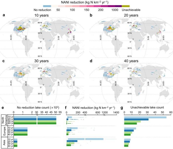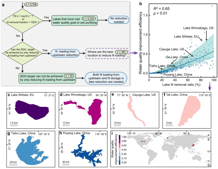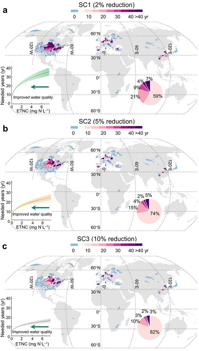 研究团队进一步结合动态质量平衡模型,将氮素消纳速率反演模型与湖泊氮素收支相结合,提出了实现联合国清洁水目标(<1 mg N/L)的全球流域氮素管理路径: