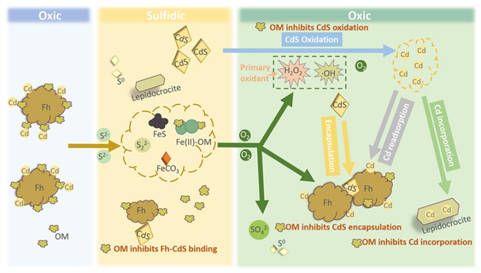 为进一步研究有机质、铁、和硫如何共同调控Cd在厌氧-好氧过程中的归趋,研究团队对吸附于水铁矿表面的Cd在硫化-再氧化过程中的迁移转化行为进行密切追踪,并考察有机质的影响。结果表明,在硫化过程中,S(-II)被完全消耗,部分水铁矿被还原为Fe(II),同时有机质从水铁矿表面解吸,吸附于水铁矿表面的Cd则完全转化为CdS。再氧化过程中,Fe(II)被氧化为Fe(III)氧化物,有机质被重新吸附。与此同时,一部分CdS发生了氧化,该氧化行为主要由Fe(II)氧化产生的H2O2驱动,·OH和O2亦有一定贡献,然而,有机质通过消耗H2O2抑制了CdS的氧化过程。从CdS中释放的大部分Cd重新吸附至Fe(III)氧化物表面,少部分释放的Cd则嵌入Fe(III)氧化物晶格中。此外,一部分CdS被包裹于Fe(III)氧化物聚集体内,但有机质与Fe(III)氧化物的相互作用抑制了惰性态Cd(嵌入态Cd、包裹态CdS)的形成(图2)。