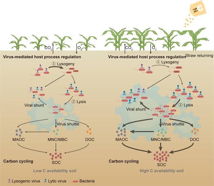 微生物是陆地碳循环的主要驱动者,控制着土壤有机质中的碳储存与向大气释放的CO₂之间的平衡。土壤病毒作为土壤碳循环的重要组成部分,通过侵染作用显著影响微生物群落动态和功能。然而,病毒如何调控农田土壤有机碳积累的机制尚不清楚。