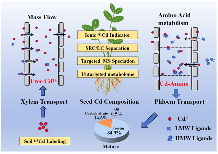 在Cd转运的分子形态特征方面,研究团队结合稳定性同位素增强质谱技术、多维色谱分离和代谢组学分析,发现木质部导管中近一半的Cd主要以无机离子态存在,尤其在花针期和荚果期,这有利于Cd向地上部转运。通过精确分子量提取和Cd同位素信号解析,发现有机组分中半胱氨酸(Cys)是Cd运输的主要螯合配体,而非传统的苹果酸、柠檬酸或小分子肽等物质。韧皮部转运研究表明,80%以上的Cd以有机结合态存在,包括1.8-17kDa大分子复合物。代谢组学揭示了不同时期韧皮部氨基酸代谢产物变化特征与Cd从地上部向籽粒迁移效率的一致性。结合最终籽粒Cd与氮、硫、氧等元素的分布特征及其在不同养分的赋存比例,明确了Cd可能主要通过与氨基酸类物质结合而赋存于籽粒蛋白质中。