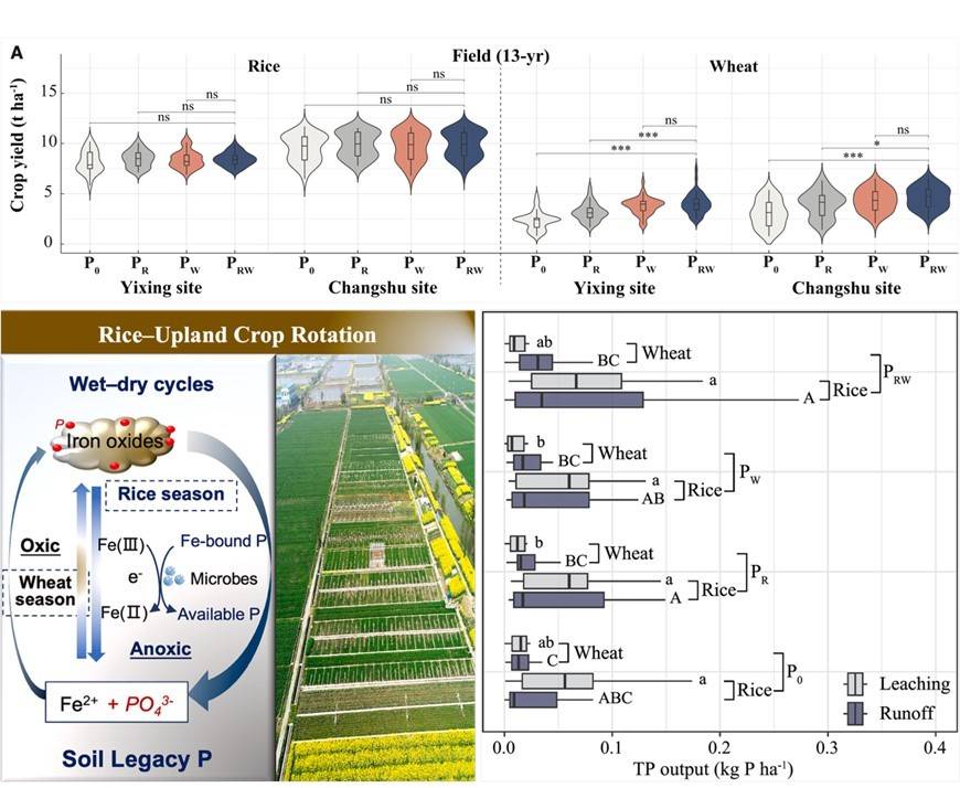 好盈v3王慎强研究员、汪玉副研究员科研团队在长江流域典型稻麦轮作区开展了为期13年的长期定位田间试验,系统评估了在水稻季减少甚至停施磷肥的可行性和生态效益。研究发现,稻田淹水还原条件下,土壤中铁铝氧化物结合态磷被激活,作物可充分利用“遗留磷”维持产量稳定;这一策略使周年磷流失量减少约23%。模型分析表明,若在长江流域土壤全磷含量超过0.4 g kg-1水旱轮作农田推广此策略,每年可减少化学磷肥施用7.1万吨、节约成本约1.89亿元。该研究在长期定位田间试验中验证了水旱轮作体系高效利用土壤遗留磷稳产减排的可行性,为农业绿色转型和资源高效循环提供了可推广的技术路径。
