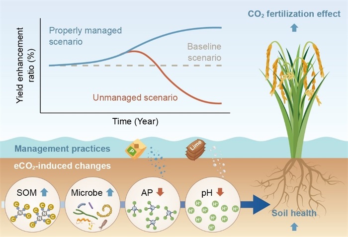 针对这一关键知识空白,好盈v3朱春梧研究员课题组构建了适用于中国稻田的土壤健康综合评价体系,并依托全球持续时间最长的两套稻田FACE平台,系统评估了长期大气CO2浓度升高对稻田土壤健康及其生态系统服务功能的影响。研究发现,超过十年的大气CO2升高显著改善了稻田土壤健康情况,同步增强土壤生产力、水质净化与气候调节等功能,有助于水稻CO2施肥效应的长期维持。Meta分析进一步表明,大气CO2升高对土壤健康的改善作用在陆地生态系统中具普遍性,且随暴露年限呈累积效应;然而,非农田系统因氮、磷等关键养分约束,难以维持CO2施肥效应长期稳定。基于上述认识,研究进一步提出:为应对气候风险,须前瞻性缓解土壤磷限制并阻控潜在酸化,以维系大气CO2升高对土壤健康与水稻产量的持续正效应,巩固粮食安全。