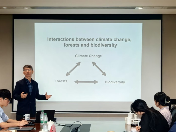 学术交流会上,Yowhan Son教授作了题为“Nature-based solutions for sustainability: focusing on afforestation in arid regions”的学术报告。报告中,Yowhan Son教授阐述了森林-气候变化-生物多样性的相互作用机制及土壤在其中发挥的重要作用,并对基于自然的森林可持续发展方案、方法进行了比较分析。Yowhan Son教授特别指出,土壤碳汇研究具有长久的生态和经济效益,对可持续发展和森林管理具有重要意义。Yowhan Son教授还与参会师生就农田土壤固碳方法以及面临的挑战等方面进行了讨论。