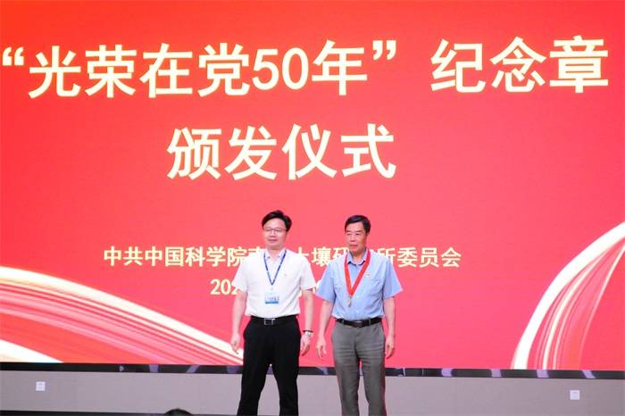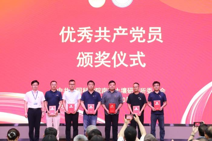随后现场举行了 “光荣在党50 年”纪念章颁发仪式,向为党和国家事业辛勤奉献半个世纪的老党员们致以崇高敬意。党委书记华伟宣读了《关于表彰优秀共产党员的决定》,为8名在科技创新、管理服务等岗位表现突出的党员颁发荣誉证书,表彰他们在为研究所改革发展和土壤科学事业中发挥的先锋模范作用。优秀党员代表郭志英结合工作实际分享初心故事。