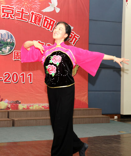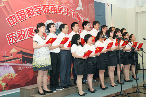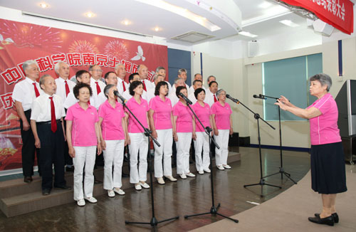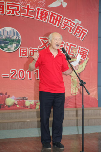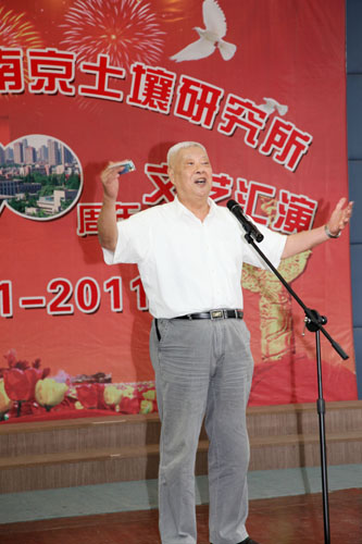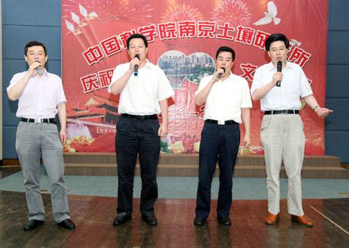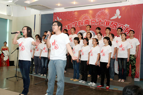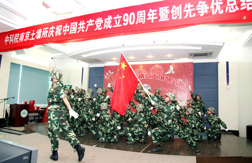 总结表彰活动结合后举行了红歌大家唱文艺汇演,所领导、党支部、离退休同志、研究生纷纷登台纵情高歌,各参赛队以强大的演出阵容,充满激情的艺术形式,分历程、赞歌、奋进三大篇章简要回顾了中国共产党90年来的光辉足迹,深情地抒发了爱党之情、报国之志。离退休一支部以气势磅礴的大合唱《没有共产党就没有新中国》拉开序幕,《解放区的天是明朗的天》使大家仿佛看到解放区人民虽然生活暂时比较艰苦但没有了压迫欺凌,呈现出一派欢天喜地的景象;在省教科工会演讲比赛中获得三等奖的研究生激情演讲《党恩永不忘》,以深情的语言、挚热的情感呼唤新时代的青年学子们要牢记党的历史,要感恩过去、面向未来,学习先进、坚定信念,努力成为中国的脊梁;老党员徐映红的民族舞蹈《沂蒙颂》以优美的舞姿展现了沂蒙山革命老区人民为了救助自己的子弟兵而不惜牺牲自己亲人的英雄壮举,感染了与会观众,赢得了阵阵掌声,为她60岁生日做了最好的注脚;《歌唱祖国》、《大中国》、《明天会更好》、《北京颂歌》、《美丽的草原我的家》、《东方之珠》、《我们走在大路上》、《团结就是力量》、《咱们工人有力量》、《大海航行靠舵手》、《游击队之歌》等一批红色经典老歌表达了90年来华夏民族在中国共产党的坚强领导下,不屈不挠、英勇斗争的可歌可泣的光辉历史,祝福伟大的祖国永远年轻、日益强大,更加灿烂、愈加辉煌;四位所领导给大家带来的《我的中国心》,以高亢的歌声向全所职工传达了爱国爱所之情,深深打动了观众的心,引起了大家的强烈共鸣;在南京分院庆祝建党90周年文艺汇演中获得一等奖的研究生表演唱《当那一天来临》使大家仿佛看到了年轻一代不负祖国的重望,为了祖国免遭欺辱而时刻准备着拿起钢枪,使大家感受到当代年轻人是有强烈责任感和历史使命感的一代,青年学子们演绎得是如此气势恢宏,赢得了经久不息的掌声,将演出推向了高潮……一个个支部、一个个党员面对党旗放声歌唱,一首首红歌、一段段深情演绎着对党的热爱。特别让人敬佩的是老同志、老党员不畏酷暑,积极参加文艺汇演,赵其国院士用他那高昂有力的一曲《我和我的祖国》表达了对党、对人民、对祖国的热爱和无限忠诚;老党员高以信的《天路》赞美了在党的领导下人民群众用铁一样的双手创造了奇迹,把通往雪域高原的天堑变成了通途,横贯东西的青藏铁路似乎就在眼前;参加过抗日战争、解放战争、抗美援朝的老党员周建桂通过《清平乐·六盘山》和《解放军占领南京》回忆红军战士的豪迈气概和百万雄师过大江的壮举场面,那血与火的年代仿佛又重现眼前。