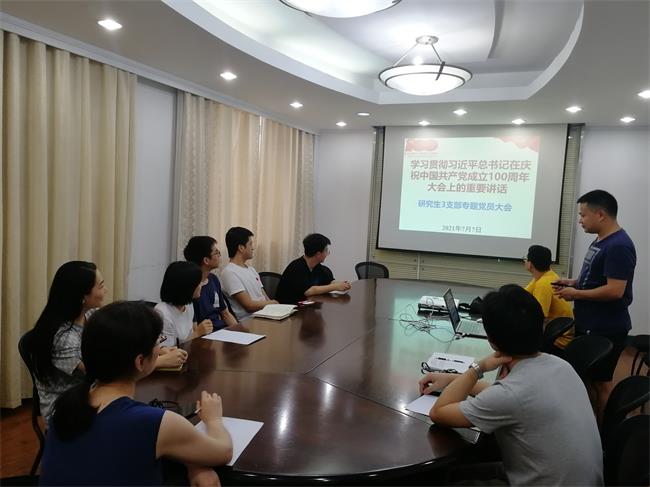 7月7日下午,研究生3支部在实验楼3楼会议室召开党员大会,专题学习习近平总书记在庆祝中国共产党成立100周年大会讲话和“七一勋章”颁授仪式讲话,会议还传达学习了院党组书记侯建国在专题党课报告会上的讲话,会议党支部书记游来勇主持。